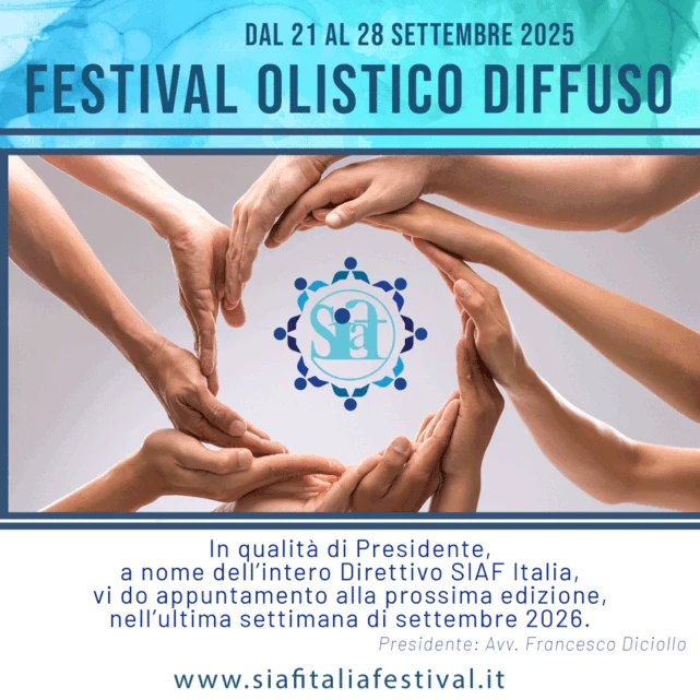 SIAF Italia ha organizzato sul territorio nazionale dal 21 al 28 settembre 2025 il Terzo Festival Olistico Diffuso, in cui i Professionisti e gli Enti di Formazione iscritti nei registri di SIAF Italia promuovono, condividono e presentano, in forma gratuita, attività di gruppo, mostre, convegni, laboratori ed incontri individuali, con l'obiettivo di creare rete, diffondere pratiche di benessere ed espandere la conoscenza del valore delle professioni del mondo olistico.